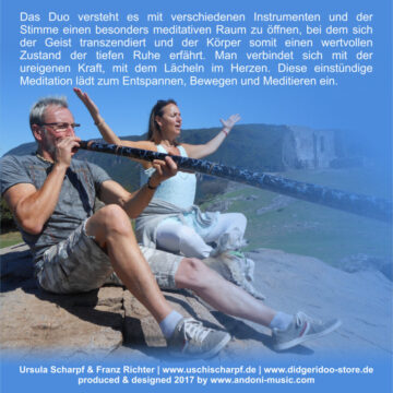 „Didge Explosion“ Toller Didge Sound mit pulsierenden Rhythmen. Eine CD von und mit Andoni (Ursula Maria Scharpf & Andreas Bindig) und Franz Richter.