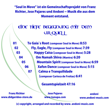 „Soul in Move“ ist ein gemeinsames Projekt von Franz Richter, Josè Pajares Alva und Andoni.  Entstanden ist eine wunderschöne CD mit Musik und Klänge des Ur-Quells.